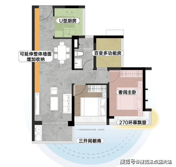 :该户型为三房两厅一卫设计,建筑面积约80㎡,是金融岛稀缺的南向江景小户型,精准匹配刚需家庭或新婚夫妻需求。户型整体布局方正,空间利用率高,无浪费空间,全南向设计,拥有南向9米采光面,阳光可直达室内各个区域,采光通风俱佳,让室内时刻保持明亮通透。特色设计方面,配备6m³整墙收纳系统,巧妙利用空间打造收纳区域,解决小户型收纳难题,让家居环境更整洁;5㎡全景厨房,空间宽敞,采用U型布局,操作便捷,采光充足,让烹饪成为一种享受;270°景观主卧,配备L型飘窗,可俯瞰珠江江景和社区园林景观,视野开阔,闲暇时可坐在飘窗上观景、休憩,提升居住舒适度;卫生间采用干湿分离设计,干净卫生,使用便捷,满足日常家庭需求。该户型总价适中,首付压力小,是刚需客户上车金融岛的优选户型。