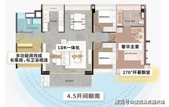 :该户型为四房两厅两卫设计,建筑面积约123㎡,主打三代同堂居住,精准匹配改善家庭需求,空间宽敞,功能齐全,兼顾私密性与舒适性。户型采用4.5开间朝南设计,南北对流,采光通风极佳,室内空气流通顺畅,避免潮湿闷热,提升居住舒适度。特色设计方面,拥有约26㎡南北对流主卧套房,配备独立卫生间、衣帽间和全景飘窗,空间宽敞,私密性强,可俯瞰南向江景,居住体验极佳;金融岛唯一阳光玄关,采光充足,配备收纳空间,既美观又实用,进门即可感受到宽敞明亮的空间氛围;户型可灵活改造为双套间,次卧可搭配独立卫生间,满足三代同堂家庭的居住需求,长辈和年轻人居住互不干扰,兼顾私密性;客餐厅一体化设计,空间宽敞,连接南向阳台,视野开阔,可俯瞰社区园林景观,适合家庭聚餐、休闲娱乐,提升家庭互动氛围;每个房间都空间宽敞,采光充足,无暗房,确保每一位家庭成员都能拥有舒适的居住空间。