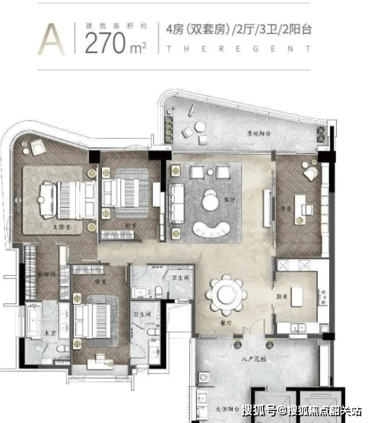 这是南天名苑洋房产品线中的旗舰户型,专为塔尖人士打造。9米超大邮轮式阳台是其标志性特征,如同航行在江上的豪华游轮,气势磅礴。阳台宽度足以摆放户外沙发、餐桌、烧烤架等,成为家庭聚会、朋友沙龙的理想场所。42㎡阔绰主卧堪称“套房中的套房”,不仅拥有270°环幕江景,还配备双人浴缸、步入式衣帽间、化妆台等高端设施,尽显尊贵气质。专梯专户设计,确保隐私不受打扰;墅级空中双花园,则将自然引入高空,营造出“空中庭院”的独特体验。整体空间尺度宏大,动静分区明确,社交区与休息区互不干扰。总价1350万起,代表着广州主城区江景豪宅的最高水准。